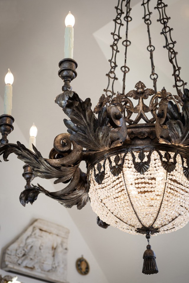 Each Santini chandelier is fully handmade by Ebanista artisans. Its wrought iron frame is hand-forged and shaped into acanthus-scrolled arms, surrounding a crystal basket that forms a striking focal point at the center of the piece.