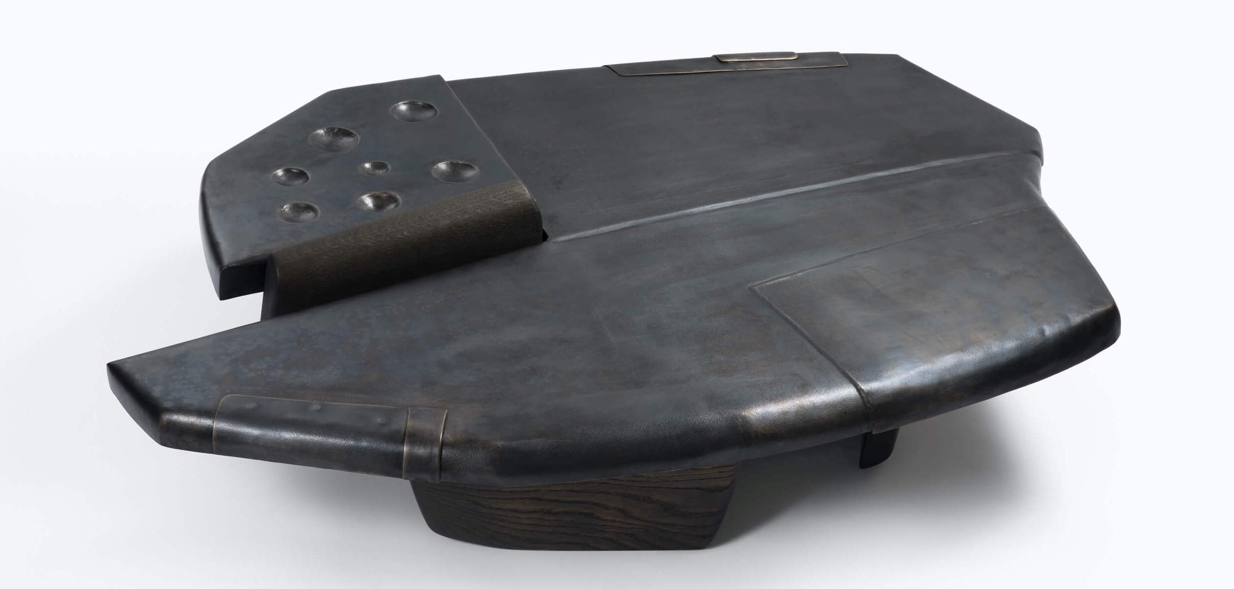 Husan Cocktail Table Shown in darkened bronze and CASTE Studio oak iron finish